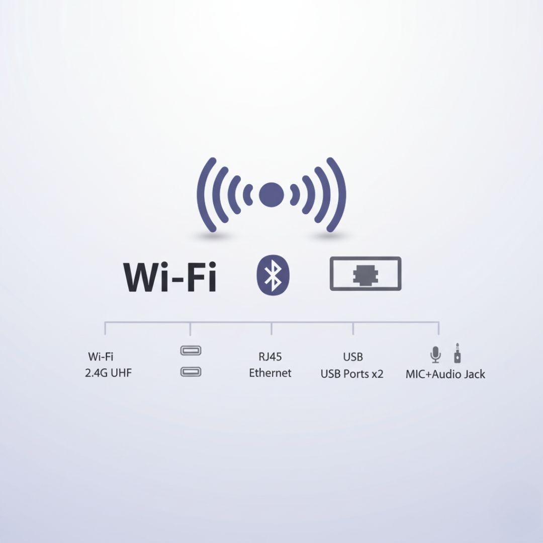 Conectividad Completa para Entornos Profesionales: Incluye Wi-Fi 2.4G de alta velocidad, Bluetooth 4.0, puerto RJ45 (Ethernet) para conexión por cable estable, y puertos USB (x2) para periféricos como teclados o lectores de códigos.